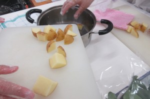 家庭科の調理実習の様子です。林間学校でもみんなで協力