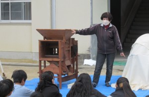 等の体験をしました。こうした昔の農機具が本校に保管され