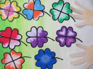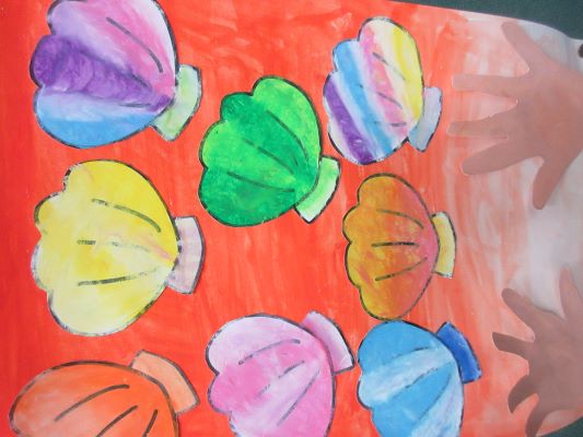 写真は3年生の作品です。色とりどりのホタテとクローバーが