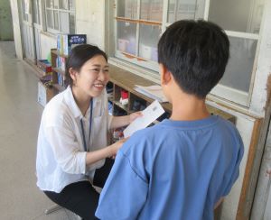 先生が笑顔で手渡しています。